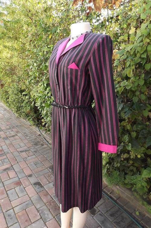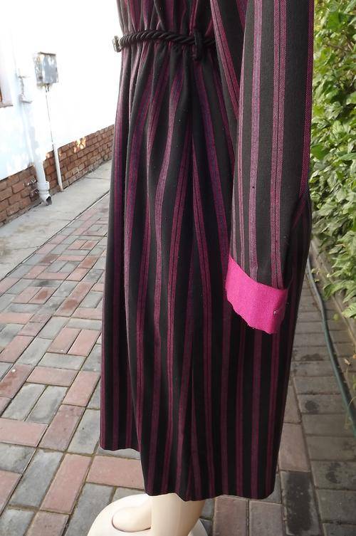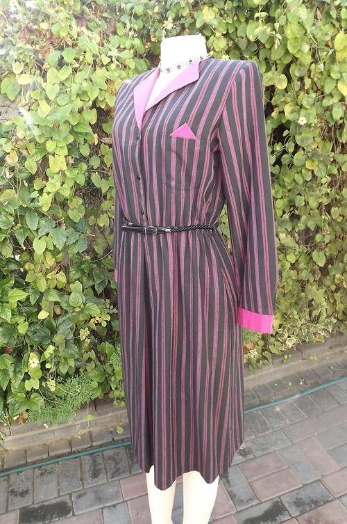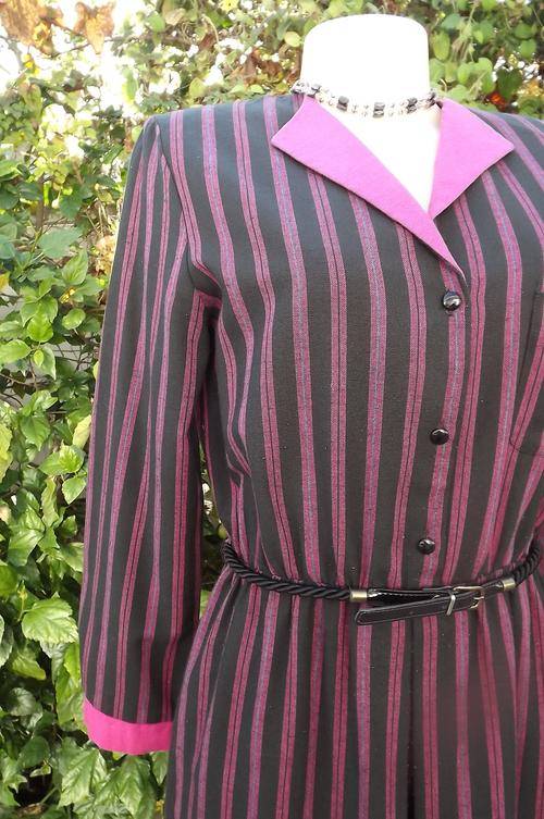 Stylish black long sleeve Vision dress with cerise stripes,collar and cuffs.Size 35/11.Bust 94 cm.Button down top with pocket.Elasticated middle.Inverted pleat on front with black belt.As new