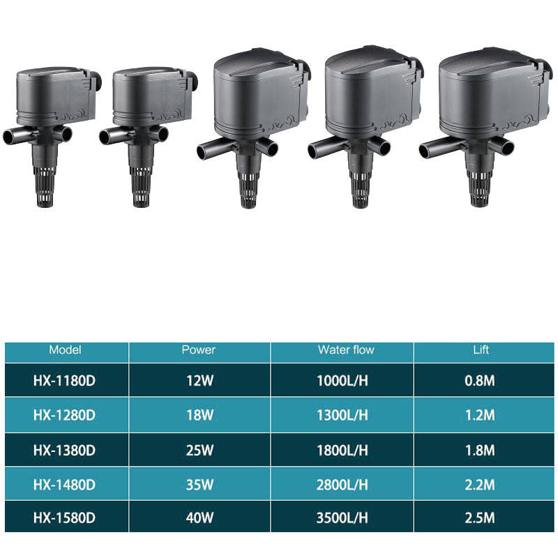 Item Specifics: Product Category: Submersible pump Material: ABS Weight: 10g or more Power: 12W/18W/25W/35W/40W Lift: 0.8M, 1.2M, 1.8M, 2.2M, 2.5M Water flow: 1000L/H, 1300L/H, 1800L/H, 2800L/H, 3500L/H Specifications: HX-1180D, HX-1280D, HX-1380D, HX-1480D, HX-1580D Features: --Brand new and high quality. --Low noise. --Max flow rate: 3500L/H. --Max Head(lift height): 2.5M. --Water proof class: IPX8(can be submersible installed) Package Included: 1 x Water Pump