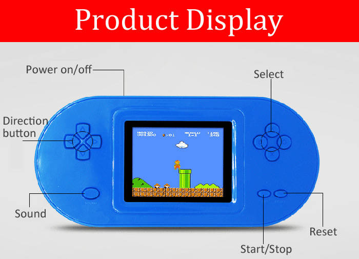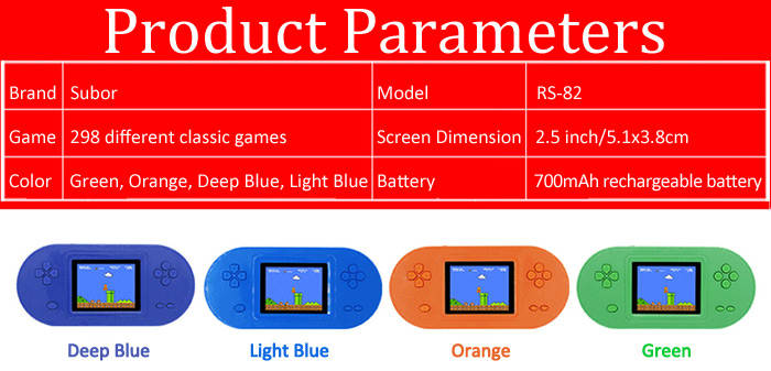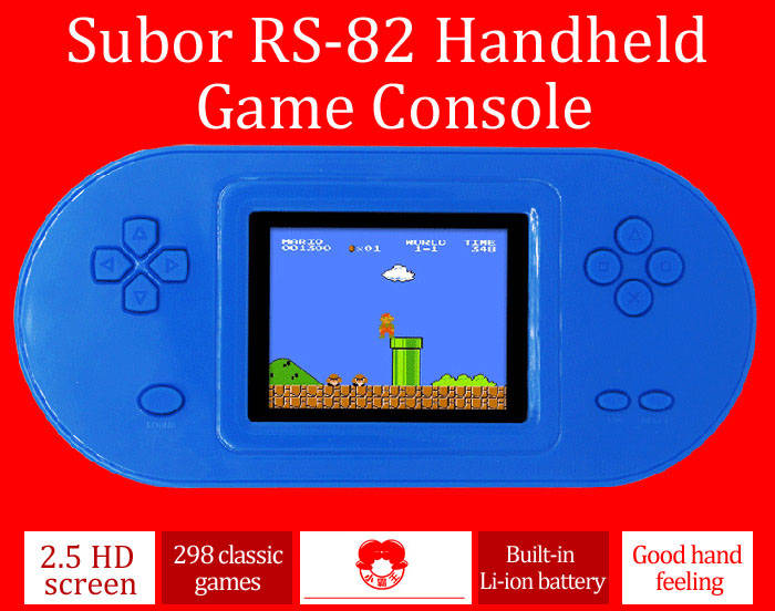 Subor RS-82 PSP handheld game console. Built-in 298 different classic games . With 2.5 inch HD screen, very suits for children, convenient for operation. Cover with environmental ABS material, safer for kids. Built-in 700mAh rechargeable Li-ion battery. Perfect gift for children.