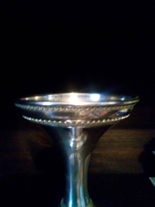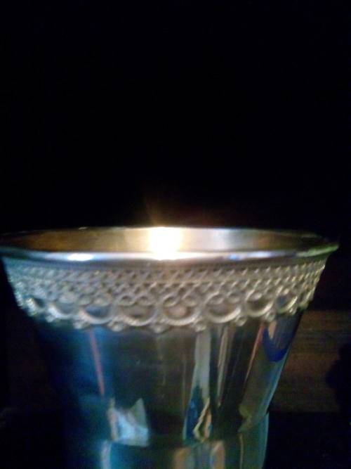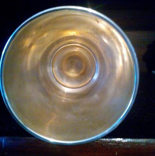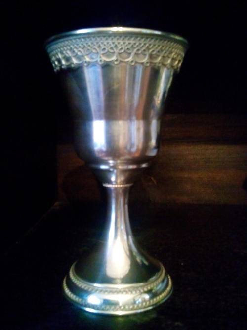 Sterling silver ceremonial Judaic kiddush cup.Stands135mm high and measures 76mm across.Foot,waist and rim decorated with applied filigree work.Weighs 102grams.Makers mark(Radav?),handmade and sterling inscribed to inner bottom of cup.Inner cup gilded.In very good condition.