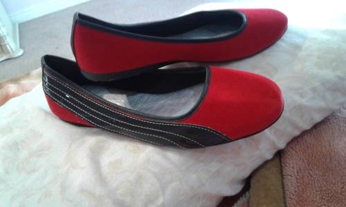 SUEDE PUMPS- RED WITH BLACK STRIPES.
