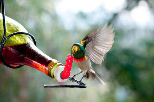 Try and hang the bottle near a tree or bush so the birds feel secure. Once the birds are used to you they will drink from the bottle while you hold it in your hand,(takes a bit of time though) The bottle is also used by White-eyes, weavers and bull bulls and is great next to a seed feeding platform.