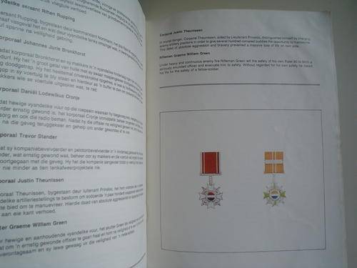 A4 grootte blad met 17 bladsye. In goeie toestand. R46 posgeld in SA. Also inside a Honoris Crux decoration to Sapper Johannes Jacobus Badenhorst, Johann Lehman, Gerhard Martin Louw, Johannes Nortmann, Daniel Pyper, PJ Van Zyl, WA Dreyer, Stephanus Nel, Nicolaas Prinsloo, Tobias de Vos, T Bock, H Bremer, J Kooij, P Moos, P Van Dyk, R Rupping, J Bronkhorst, D Cronje, T Stander, J Theunissen en G Green. Annual Defence Force day Parade Cape Town.