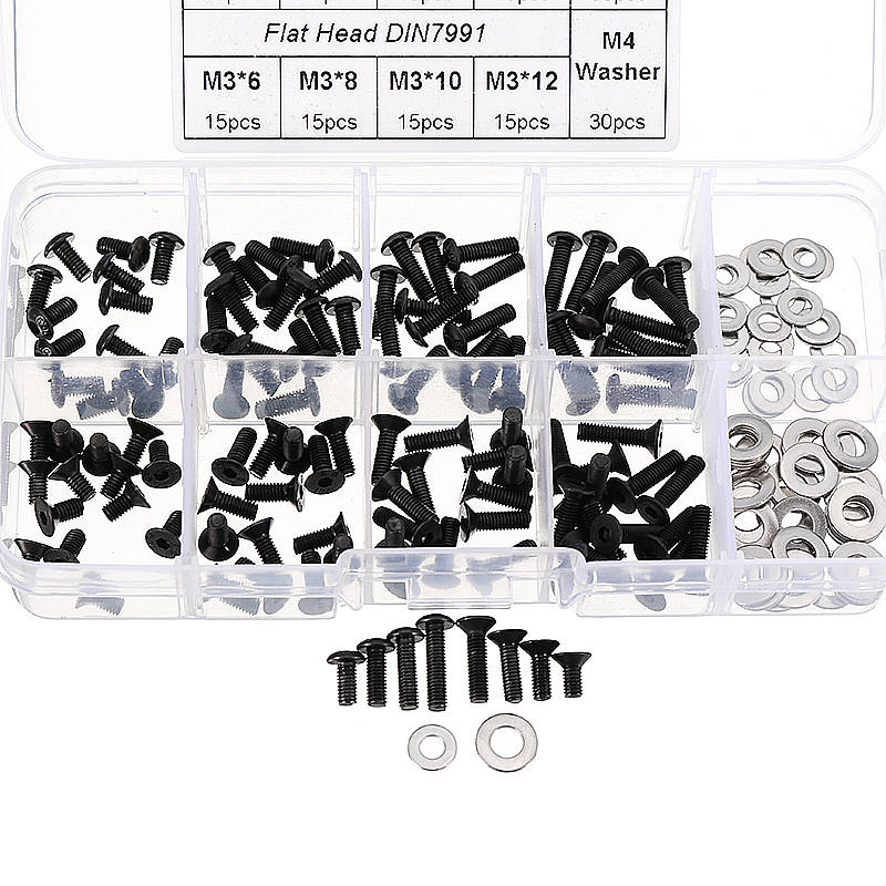 Features: - 60pcs M3 hex socket flat head screws, 60pcs M3 hex socket button head screws, 30pcs M3 flat washers, 30pcs M4 flat washers.
