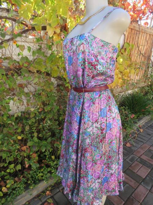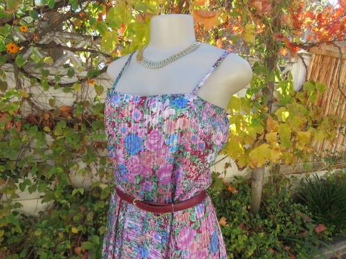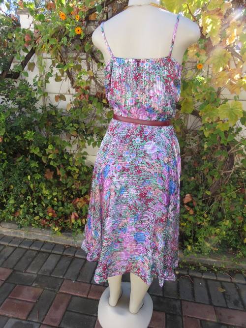 Summer strappy dress in array of spring flowers.Made by owner.Size 38/14.Fully lined.Elasticated at top back.Flare skirt.In polyester/rayon blend with striped design with belt.Fine condition.