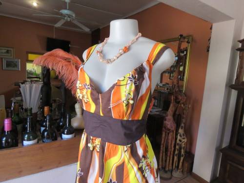 Summer strappy dress in cheerful warm colours.By 'TRUWORTHS' in size 36/12.Empire style.Brown band under bust line.Some elastic at back for good fit.Skirt with lining and frilled seam.As new.