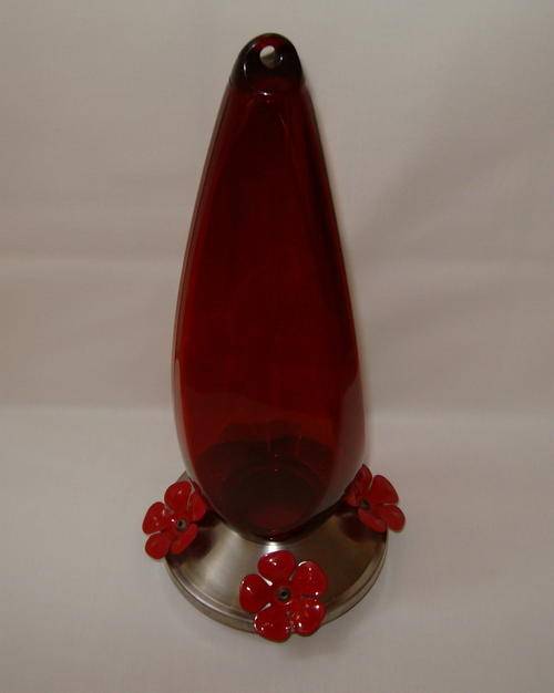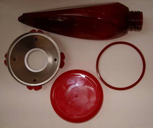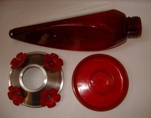 A transparent red plastic and stainless steel bird nectar feeder, complete with four red