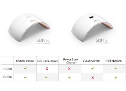 Specification: Brand: UVLED Model: SUN9s / SUN9c Power: 24W Wavelength: 365+405nm Fit Gel Type: UV Gel / LED Gel / Builder Lifttime: 50000hrs Adapter: Rated input 100-240V 50/60Hz 1a Rated output DC12V 1a Size: 8.26*4.72*3.14inch Weight: 450g Package List: 1x Nail Lamp 1x Manual 1x AC Adapter (us or eu plug)