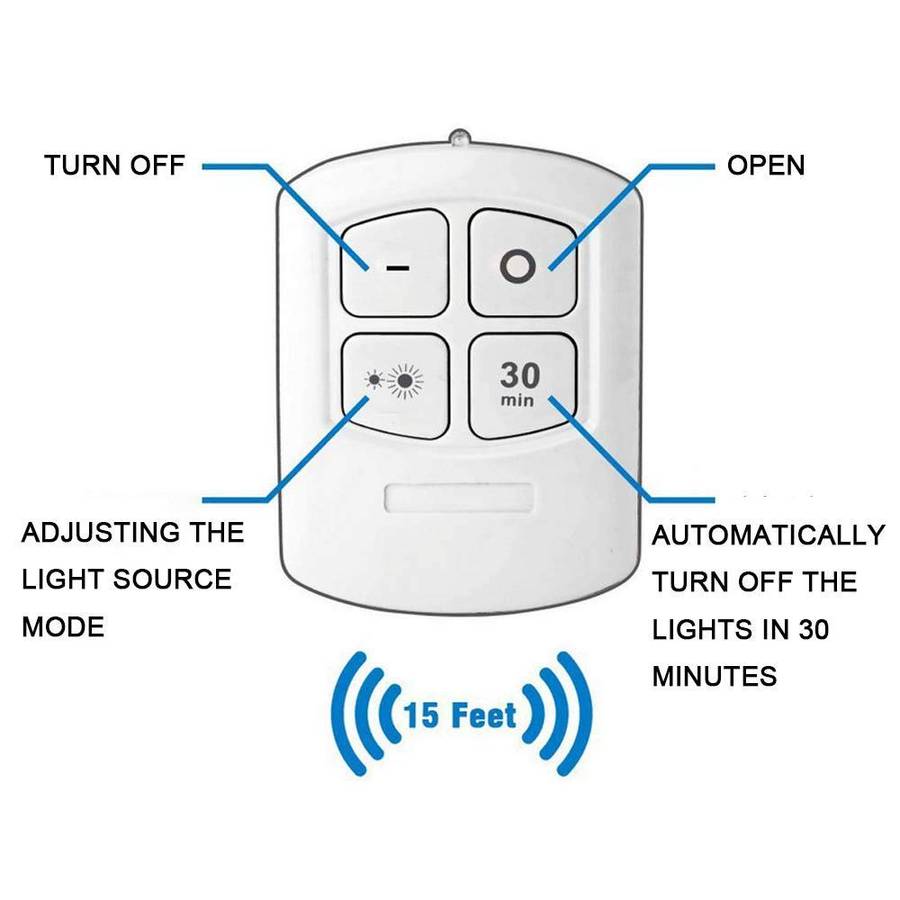 Easy to install, can be installed anywhere you want to light; The remote control allows the lamp to adjust level 2 brightness and time control, turning off the light in 30 minutes wirelessly, up to 15 feet away; If you install the lamp close,you can control the lamp together. If you install the lamp has one distance,You can control a light independently You can also turn the disk light on/off by clicking the switch on the lens on the light. Powered by AAA battery for wireless installation. Suitable for kitchens, cabinets, wardrobes, counters, bookshelves, garages, basements or similar dark places where you may need to constantly have strong lighting in minutes.