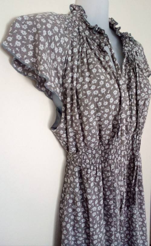 Super cute grey and white flowered dress, keyhole opening in the back, upper half is lined, by Fashion Express in good condition