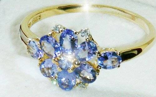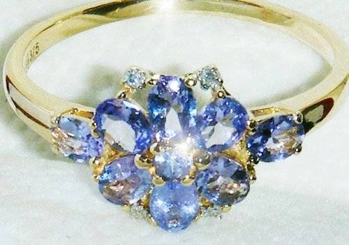 SUPERB 9CT YELLOW GOLD TANZANITE & DIAMOND CLUSTER RING SIZE U