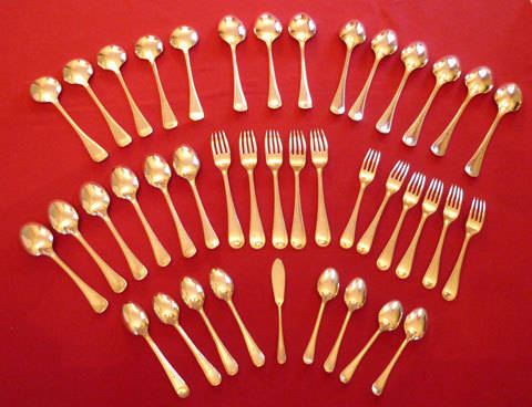 A lovely set of good quality Victorian silver plated cutlery - in the classy bead pattern. There are 40 pieces in good condition and of good weight and size and heavily plated. Maker is TW&S, although the marks are quite rubbed. The pattern is double struck (on both sides).There are 3 serving spoons (22.5cm), 6 table spoons (21.5cm), 5 soup spoons (21cm), 5 table forks (19cm), 6 dessert forks (16.5cm), 6 dessert spoons (18cm), four large teaspoons (mono G) (14cm), 4 coffee spoons (12.5cm) and a butter knife (13.5cm). Plating on all pieces is good, some minor tine wear in evidence on the dessert forks. A lovely set that would go with the thread pattern knives I have listed separately.