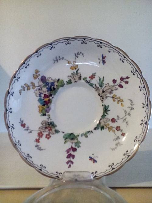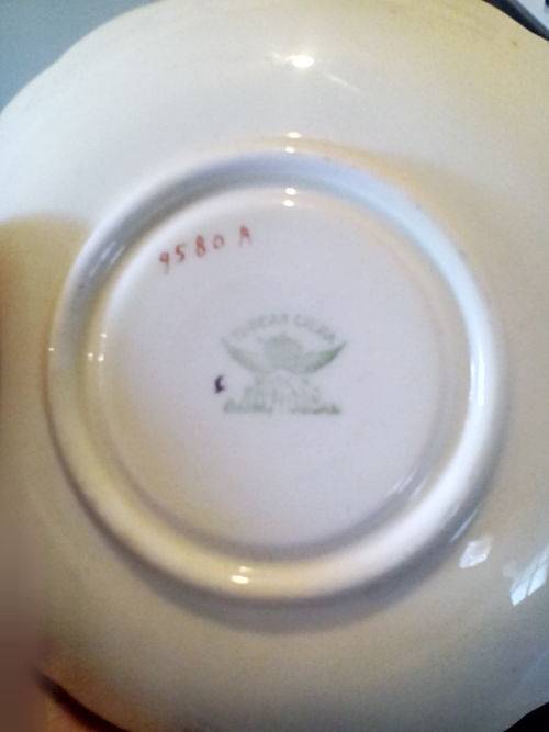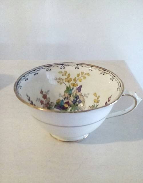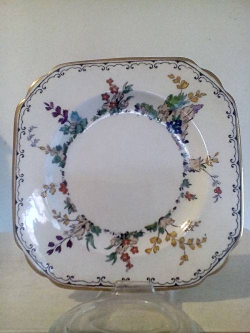 Superlative Tuscan China tea trio. Ecru coloured body handpainted and hand enamelled flowers. Square side plate with scalloped corners. Gilded edges. Side plate measures 150mm across. Saucer measures 140mm across. Cup measures 50mm high and 95mm across. Stamped to base Tuscan China and Made in England. Good vintage condition.