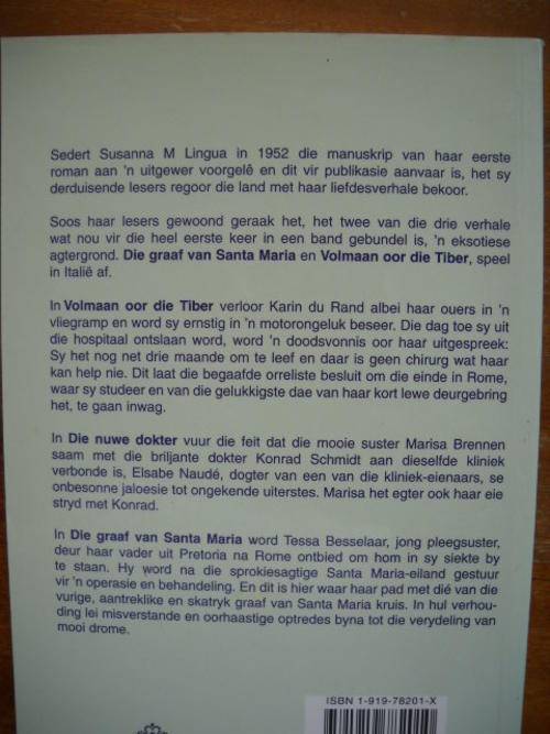 Sagteband in baie goeie toestand. Skoon binne en stewig gebind. 1998 - uitgawe met 349 bladsye. 3 Verhale, nl. Volmaan oor die Tiber, Die nuwe dokter en Die graaf van Santa Maria. 'n Lekkerlees-kopie. Posgeld in RSA = R50.00 (verhoogde postariewe 1/4/2016)