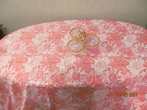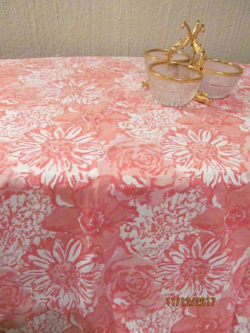 AS NEW - LARGE FLAMINGO PINK TABLE CLOTH WITH GORGEOUS WHITE FLORAL AND LINEAR PATTERNS
