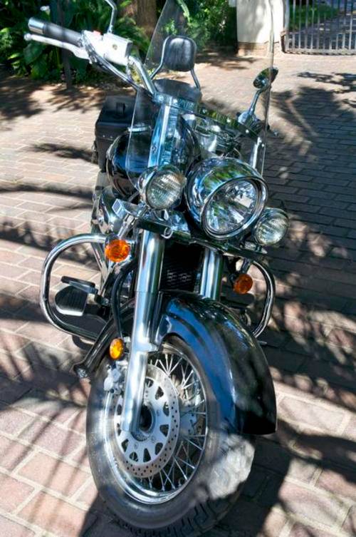 Traditional spoke wheels with chrome-plated rims carry a wide 130/90-16 front tire and 170/80-15 rear tire