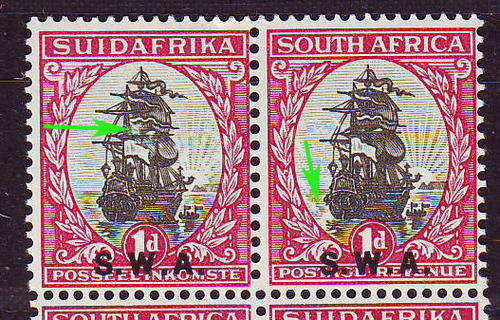 SACC 94 Var. 1d Block of four superb u/m - Varieties " White patch next to mast and below bottom pennant and speckled shading " UHB V9 Row 9/9 and 9/10 - a fine and very scarce item .{ SACC CAT. R400 as normal )