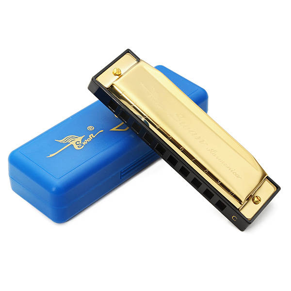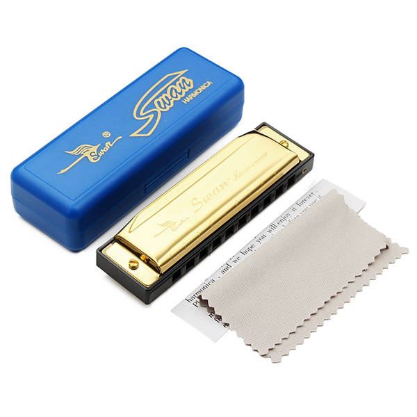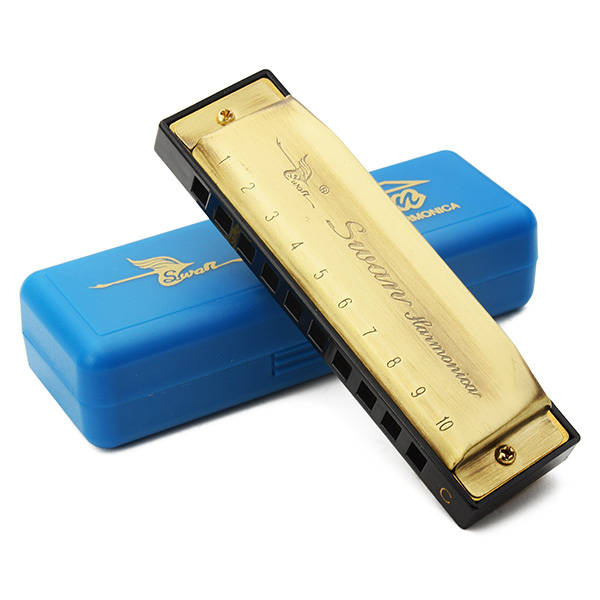 Swan 10 Hole 20 Tone Blues Harmonica SW1020 Key of C Silver Bronze Gold Description: Name: 10-hole blues harmonica Brand: Swan Model: SW1020 Tonality: C Base plate: Copper Cover: Chrome-plated brass Gongs: Phosphor Bronze Fret: green resin Size: 100X28X20MM Color: Silver,Gold,Bronze Package Included: 1 x 10-hole blues harmonica