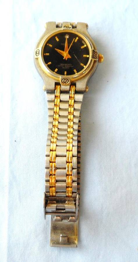This watch has Japan Movement. It has a black face with gold markings, hands and crown. It has a diamond as the 12 o'clock marker.The strap is made up of silver metal links with two rows of gold plated links, and has a clasp to close it. On the back of the watch the words "Stainless steel base, metal bezel, Water Resistant, Japan M" are incised. On the face of the watch are the words "Swanson, Japan, Diamond, Water Resistant, Quartz".