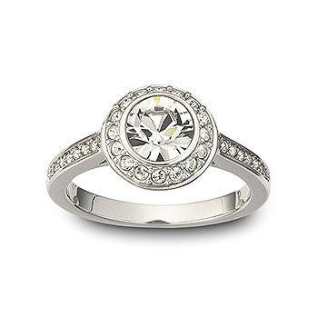 This heavenly rhodium-plated ring features a stunning clear crystal framed in delicate clear crystal pavé. Combine the ring with the matching pendant or earrings for a timeless look inspired by classic beauty.