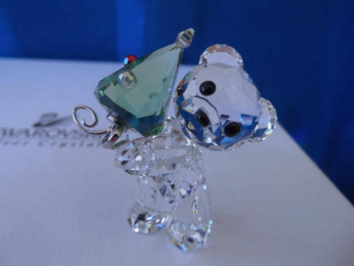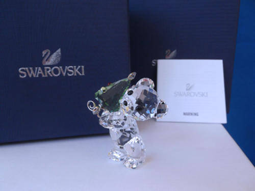 This retired Swarovski crystal limited edition 2011 Christmas Kris Bear is irresistibly cute and festive! This charming Kris Bear in fully facetted clear crystal carries a Peridot crystal Christmas tree with Light Siam Satin and Golden Shadow crystal decorations.