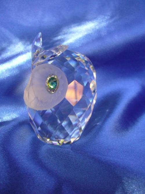 It has a clear crystal faceted body, a frosted face and stunning yellow greenish eyes.