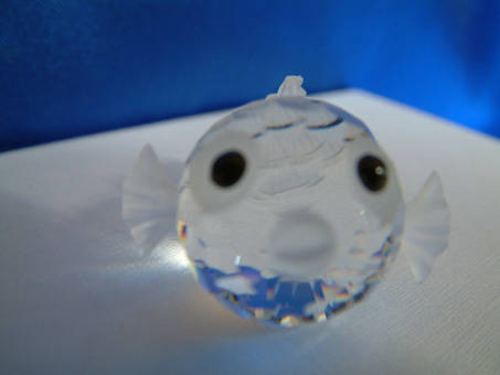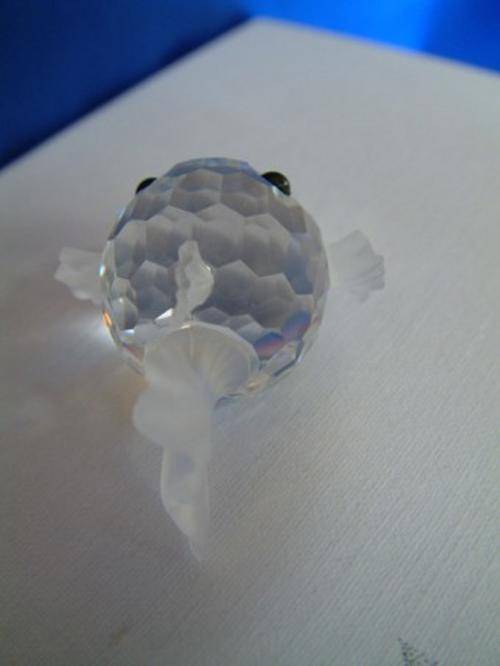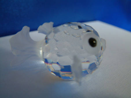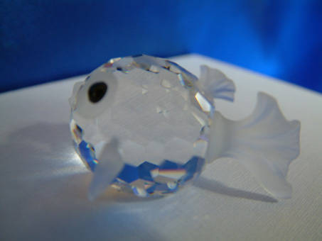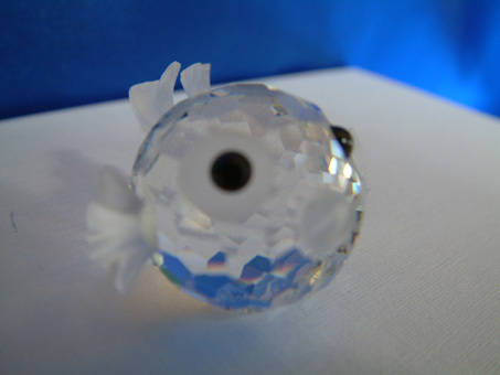 This beautiful little puffer blowfish is from Swarovski's "South Sea" collection. The main body is made from clear 30% lead crystal which is skillfully cut into many facets by the Swarovski craftsmen and is then then given it's clear silver coating which makes it sparkle in the light. The fins and tail are smooth frosted crystal and it has jet black eyes