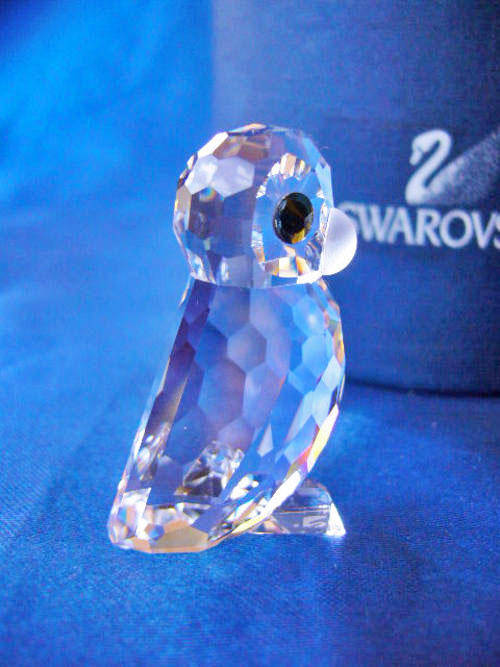 This Swarovski crystal owlet was designed by Anton Hirzinger. It stands at 1 1/2(38mm) tall, was introduced in 1995 and retired in 2000. The owlet was a member of the Woodland Friends series and is made from clear crystal, with frosted crystal beak and feet.