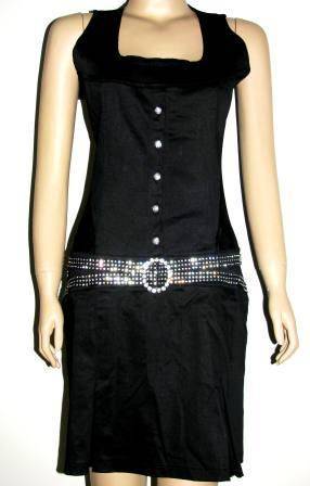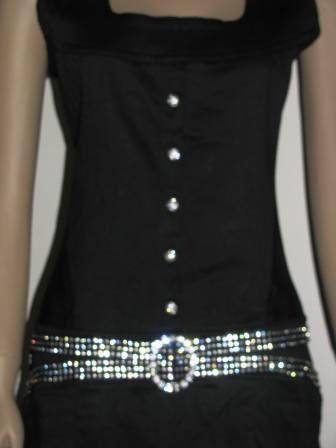 Features: Crystallized buttons and belt waistband, pleated skirt with back pockets
