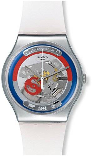 Transparent plastic case with a white silicone strap. Fixed plastic bezel. Transparent dial with silver-tone hands. Dial Type: Analog. Quartz movement. Plastic crystal. Pull / push crown. Case diameter: 41 mm. Case thickness: 10 mm. Round case shape. Band width: 20 mm. Tang clasp. Water resistant at 30 meters / 100 feet. Functions: hour; minute; second. Casual watch . Swatch This Is My World Transparent Dial White Silicone Unisex Watch SUOZ195.