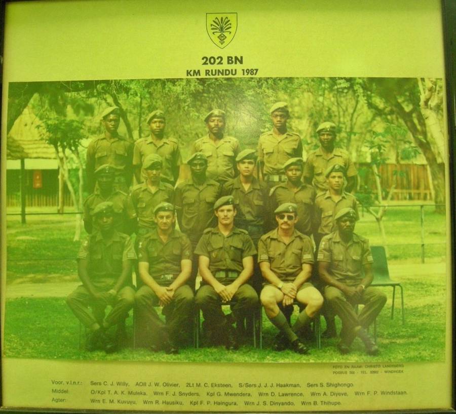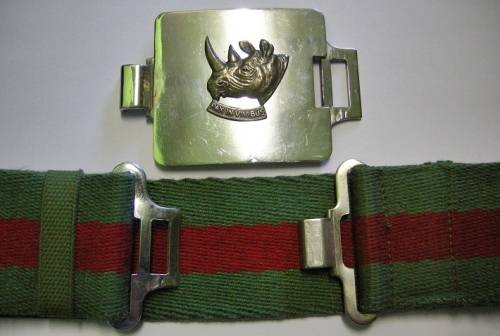 This stable belt belonged to Warrant Officer Haakman, who served in 202 Battalion. On the photograph AOII J. W. Olivier, can be seen wearing a stable belt like this. Warrant Officer Haakman, was at this stage still a Staff Sergeant (the soldier with the short pants in the photograph) and was issued with this stable belt when he became a Warrant Officer. This photograph is in our possession, but is NOT included in the sale. It is of 202 Battalion Kwartiermeester (Quarter Master) Rundu 1987. Although books state that the Rhino is the 101 Battalion beret badge, everybody in this photograph of 202 Battalion has a Rhino on their beret. It is interesting to note that more or less half of the soldiers has SWATF beret bars with the Rhino, and the rest have the South African Maintenance Unit beret bar. Four of the soldiers are wearing the 202 Battalion pocket flash.