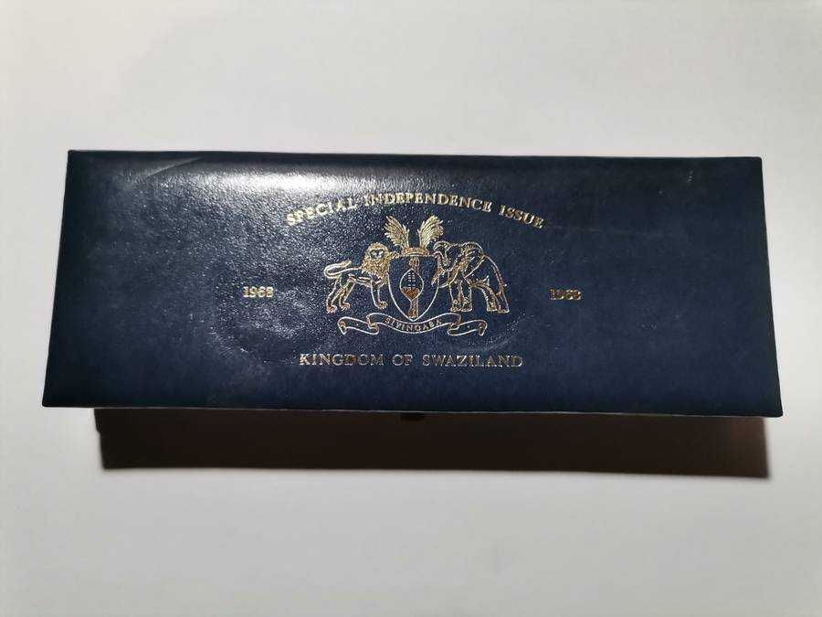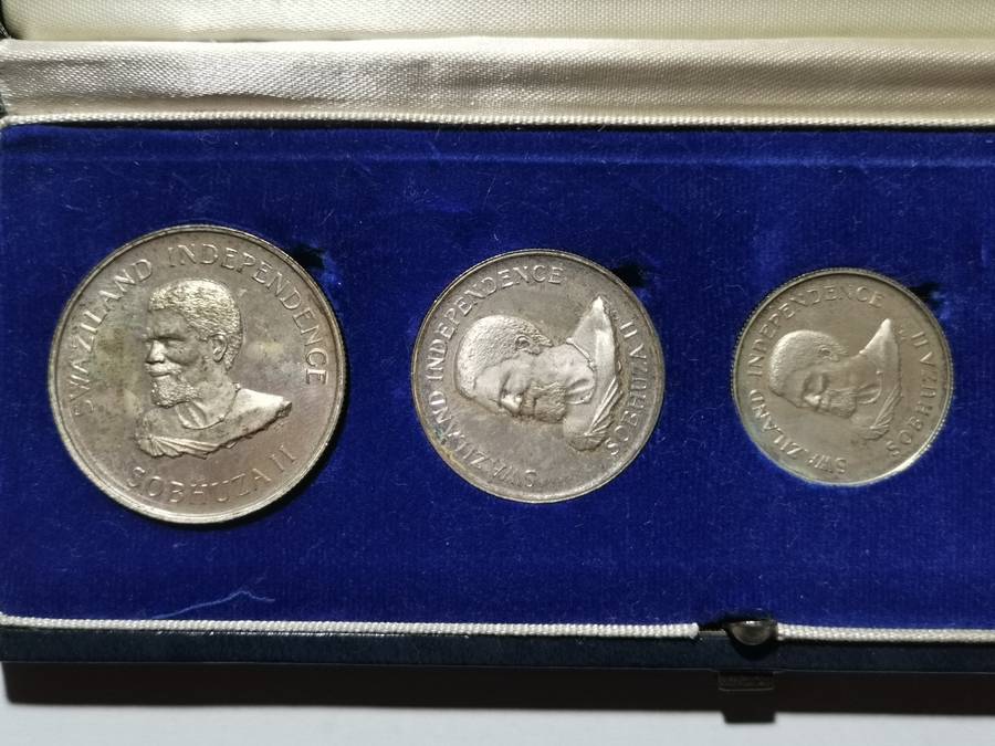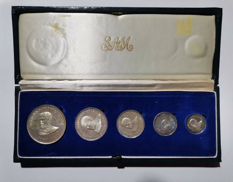 1968 Swaziland Special Independence Issue of five proof silver coins. Total weight of the silver coins is 39,9 grams of 80% silver. Mintage is 10 000, but most are surely melted down for silver content. Scarce set.