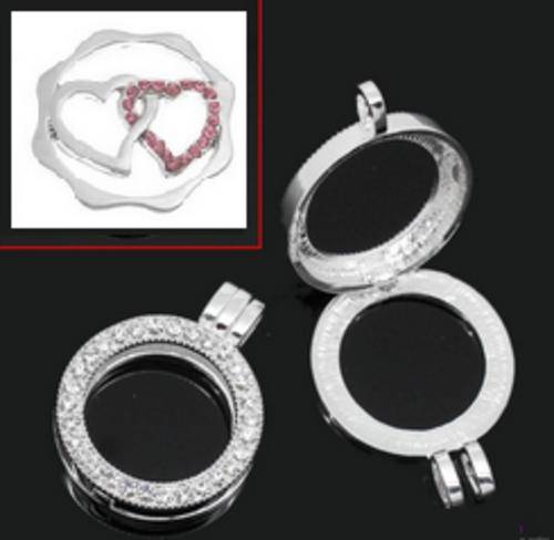 Sweater Necklace No Glass Floating Double Hearts Disc Locket with Rhinestones on Chain