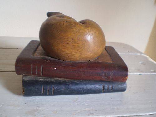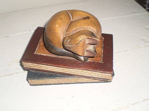 A delightful wooden cat sleeping on wooden books. The ornament is 9cm high, 13 cm in length and has a width of 9 cm. Very solid and in good condition.