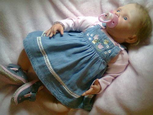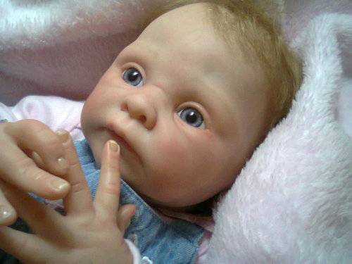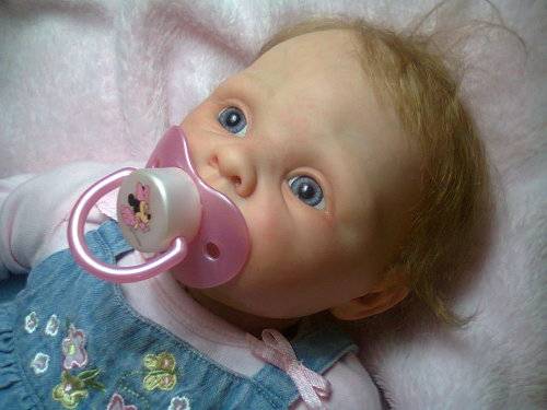 Adorable, sweet little baby looking to be adopted. She is wonderfully made with love and feels, looks and even smells just like a real baby. She is a newborn size and wears newborn and some 0-3month baby clothing. Her hair has been hand rooted and she has gorgeous baby blue eyes. This is NOT a toy and should never been handled by children due to the materials used . She is fitted with a very strong magnet and is not safe to be handled by persons with pacemakers or any other electronic equipment. The baby will be going home as seen as well as an extra set of clothing, toy, blanket and her adoption certificate.
