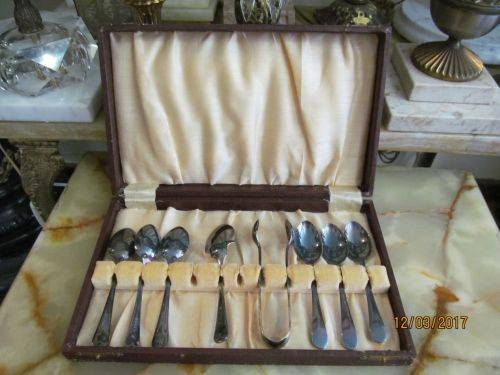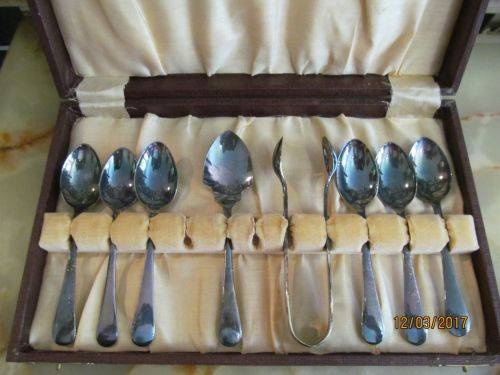 VINTAGE CUTLERY IN PRESENTATION CASE - DOVETAIL PATTERN - TONGS, SUGAR SPOON, 6 CAKE/DEMITASSE SPOONS