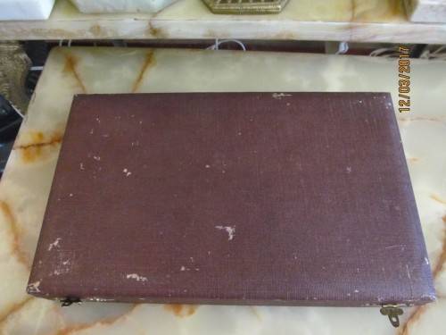 The Presentation case consists of a Brown Leatherette covering and is lined inside with silk. The tray area has 11 slots covered in Velvet and this leads me to believe that 2 items are missing from the set, or that this presentation case is NOT original for these items