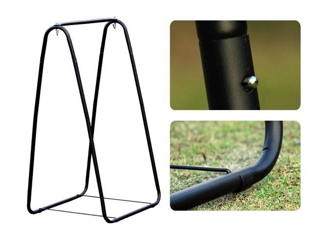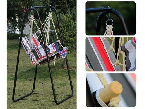 The hammock chair consists of a soft foam seat with a striped cotton cover and is suspended by ropes that link up with a crossbar. Comes with a stand, it can be set to anywhere you like, chasing the sun or hiding in shadow.