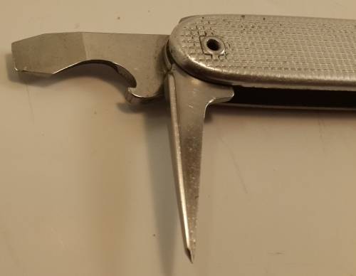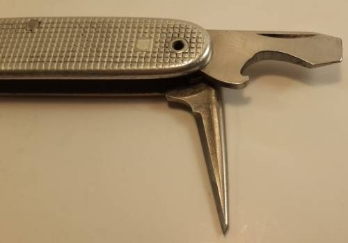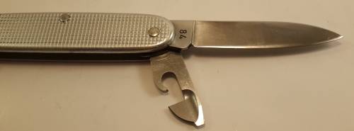 Wenger 1984 Soldier Swiss Army knives are a 93mm / 3 1/2" ribbed alox knife, with a 1984 date on the blade tang. This model was standard issue for the Swiss army during 1984. Soldier knives with an 84 date have a hollow rivet, a cutting notch in the bottle opener, and a square box for the Waffenkontrolle inspection stamp.