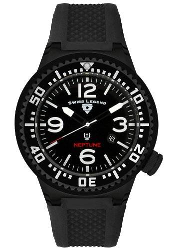 A sporty, stylish watch for active men, the Swiss Legend Men's Neptune Collection Black Textured Rubber Watch combines precision-craftsmanship with durable materials that will stand up to a rugged lifestyle. The sturdy, stainless steel case is covered with black rubber for ultimate protection against bumps and scrapes. The easy-to-read black dial features wide hour and minute hands and bold Arabic numeral hour indexes for three, six, nine, and 12 o'clock while the black ion-plated stainless steel bezel is inscribed with a seconds index. The textured, black rubber watchband is resilient and comfortable on your skin. Plus, the mineral crystal provides protection from scratches. Powered by Swiss quartz movement, the Swiss Legend Men's Neptune Collection Black Textured Rubber Watch is water resistant to 100 meters.