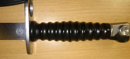 Knife bayonet for use on the renowned 7.5 mm. Sturmgewehr 57 assault rifle (the Rolls Royce of assault rifles), made by the firm Schweizerische Industrie-Gesellschaft (S.I.G.).