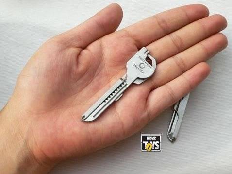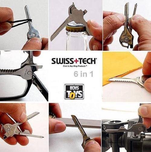 The lightest and most compact multi-use tool ever developed. This ultra-light, durable and precision crafted 6-in-1 mini-tool has a straight knife blade and a serrated cutting surface, a flat screwdriver, a Phillips screwdriver, a micro-sized screwdriver, and a bottle opener, and weighs in at an amazing 0.5 oz. The tool makes minor repairs, assemblies, installations, and hundreds of jobs an easy undertaking. The patented quick-release design easily snaps to your key ring, and just as easily releases for multiple everyday tasks. Ideal for indoor or outdoor activities and emergency situations, this gadget tool comes in handy on the road and at home!