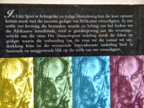 Sagteband. Stewige binding en skoon binne. Eerste uitgawe 1999 deur Human & Rousseau met 212 bladsye. Gedigte deur 23 digters o.a. Sheila Cussons, Ingrid Jonker, Antjie Krog, Marlene van Niekerk, Jean Goosen en Ronel van de Goede. Posgeld in RSA = R55.00. Ons kombineer posgeld.