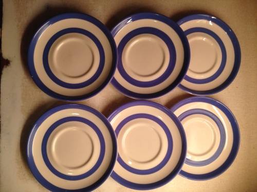 A perfect set of six saucers. No chips or cracks. They are in really good condition. Its marked that they are diswasher safe underneath!