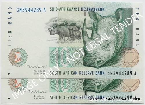 T MBOWENI 1999 1ST ISSUE 10 RAND UNC 2 NOTES SEQUENCE
