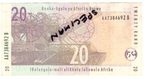 This TWENTY RAND NOTE has the Serial number AA7384692 B
