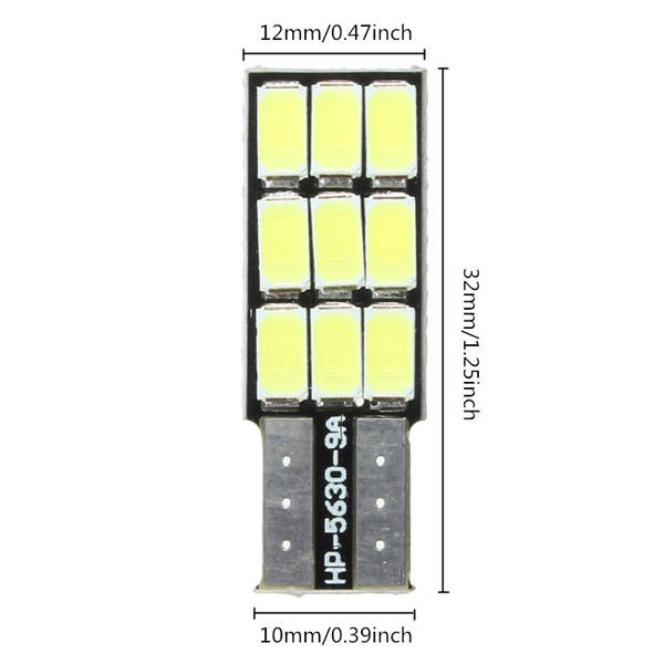 Specification: Fit for socket: T10/ 168/ W5W/ 194 Come with built-in Canbus load resistors to avoid error code on vehicles Easy to install and long lasting life Low power consumption and high brightness Type: T10 5630 Power: 12V Wattage:2.5W (per bulb) LED’s number: 9SMD LED (per bulb) Lumens: 180lm Diameter: 12mm Length: 32mm Package Includes: 1 x T10 5630 9smd CANBUS LED Bulb