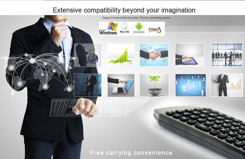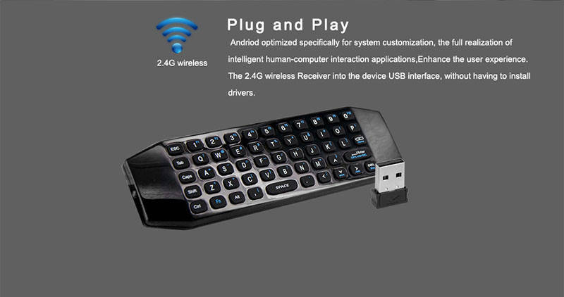 2.4G RF wireeless radio frequency techniquie Sensors: 6-Axis(Gyroscope +Accelerometer) Key numbers: 68 keys Material: ABS+Silicone Operating range: >10m Battery: Build-in lithium batteries Rated Current: 15mA Standby Current: <20μA Rated Voltage: 3.0V Compatable: Windows, Android, Mac OS,Linux; Devices: PC, Smart TV, Set-top-box, Android TV Box, Mac, Mini PC