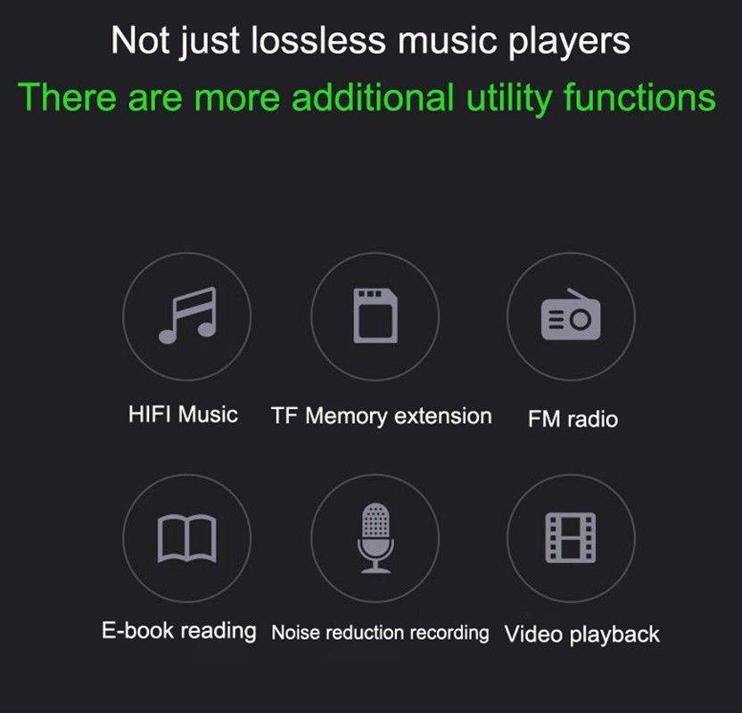 Multiple Functions: Adjustable Playback Speed, Card Reader, FM Radio, Microphone, Photo Viewer, Radio Recorder, Sleep Timer, Video Playback. The lightweight MP3 player allows you to listen to high-quality music and audiobooks during your workout or outdoor activities. With durability that matches your stamina, dynamic sound to keep you in the zone, the player offers plenty of room for your songs and audiobooks, and an integrated microSD card slot lets you add even more storage, staying motivated will be a snap. All that plus an FM tuner and large, intuitive color LCD screen for on-the-move navigation make the Sport player the perfect workout partner. Type: MP4 Screen Size: 1.8 inch Connectivity: Bluetooth, USB 2.0 Bundled Items: Extra Headphone(s) Supported File Formats: MP3, MP4 Battery Life (Hours): 80 Hours Memory Capacity: 4/8GB Storage Type: Flash Memory Card Type: TF card Video Playback Format: AVI, AMV Battery Specifications: lithium battery, 420mAh Additional Features:Touch Screen, FM radio function, picture browsing, recording function, built-in speaker, alarm clock, clock, stopwatch, text reading, video playback Screen Size: 1.8 inches, TFT 128 x 160 Player Size: 88.8mm x 40.9mm x 9.2mm Appearance Material: Zinc Alloy LRC Lyrics Synchronized Display: Support Playback Mode: repeat play, single loop, all loop, browse play, random play A-B Repeat: Support TF Card: Support, max. 256GB(Not included) Built-in Speaker: Yes Music Play Time (with earphone and screensaver status): 65-80 hours; Video Play Time: 5-7 hours Audio Playback Formats: MP3, WMA, WAV Display Type: color screen Menu Languages: English, Russian, French, Spanish, Portuguese, Japanese, Korean, Indonesian, Dutch, French, Italian, Danish, Hungarian, New Zealand, Norwegian, Finnish, Turkish, Chinese and so on.