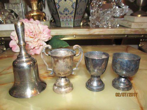VINTAGE SILVER PLATED LOT OF FOUR ITEMS - EMESS TABLE BELL, TROPHY AND SHOT GLASSES